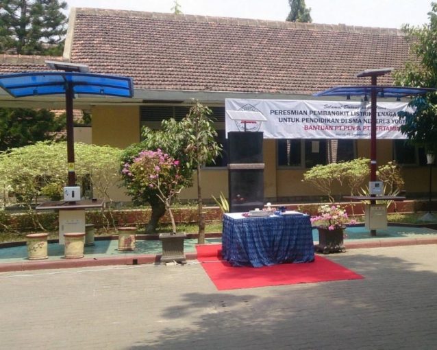 Emisi Energi merupakan salah satu hal yang harus diperhitungkan dalam dunia energi. Badan Pusat Statistik Indonesia (BPSI), memaparkan bahwa Indonesia telah memproduksi emisi sebanyak 1.053.476.000 ton di tahun 2023 yang mana juga merupakan jumnlah yang cukup banyak. Maka dari itu sebagai inisiatif dalam bertransisi ke arah yang lebih baik, PSE UGM bekerjasama dengan Pertamina dan PLN melakukan pembangunan PLTS di SMA 3 Yogyakarta.Pembangunan ini dilakukan di Laboraturium Fisika SMA 3 yogyakarta. Dengan adanya pembangunan ini Siswa/siswi SMA 3 Yogyakarta dapat secara langsung mempelajari cara kerja sistem tenaga surya mulai dari penyerapan sinar matahari hingga diubah menjadi listrik siap pakai. Diharapkan fasilitas ini dapat memfasilitasi dan meningkatkan kualitas pembelajaran siswa/siswi SMA 3 dalam melakukan pembelajaran terkait Energi terbarukan dan konversi energi.