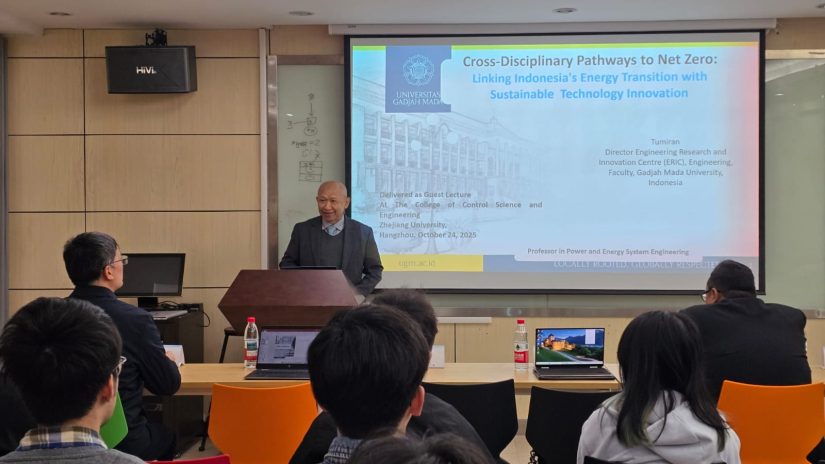 China, PSE UGM- Pusat Studi Energi UGM (PSE UGM) Pada dasarnya merupakan pusat studi yang bergerak dalam bidang green and clean energy. Sebagai bentuk bukti nyata dalam mendukung transisi menuju green and clean energy, 3 Pakar PSE UGM turut berikan kontribusi sebagai guest lecture tentang transisi energi di Zheijang University, China pada tanggal 24 Oktober 2025. Pakar yang berbicara beserta temanya antara lain Prof. Ir.Tumiran S.T., M.Eng. (CrossDisciplinary Pathways to Net Zero: Linking Indonesia’s Energy Transition with Sustainable Technology Inovation), Prof. Ir. Sarjiya S.T., M.Eng (Optimizing Power Sector Decarbonization in Indonesia through an Integrated Policy Modeling Framework), Prof. Ir. Panut Mulyono M.Eng., D.Eng (Empowering the Future: The Role of Biomass in Sustainable Electricity Generation), Ir. Lesnanto Multa Putranto S.T., M.Eng., Ph.D., IPM., SMIEEE (National Target Share of Energy Mix) . Diharapkan sumbangsih ide dan ilmu pengetahuan ini dapat berdampak nyata pada peserta dan masyarakat setempat.